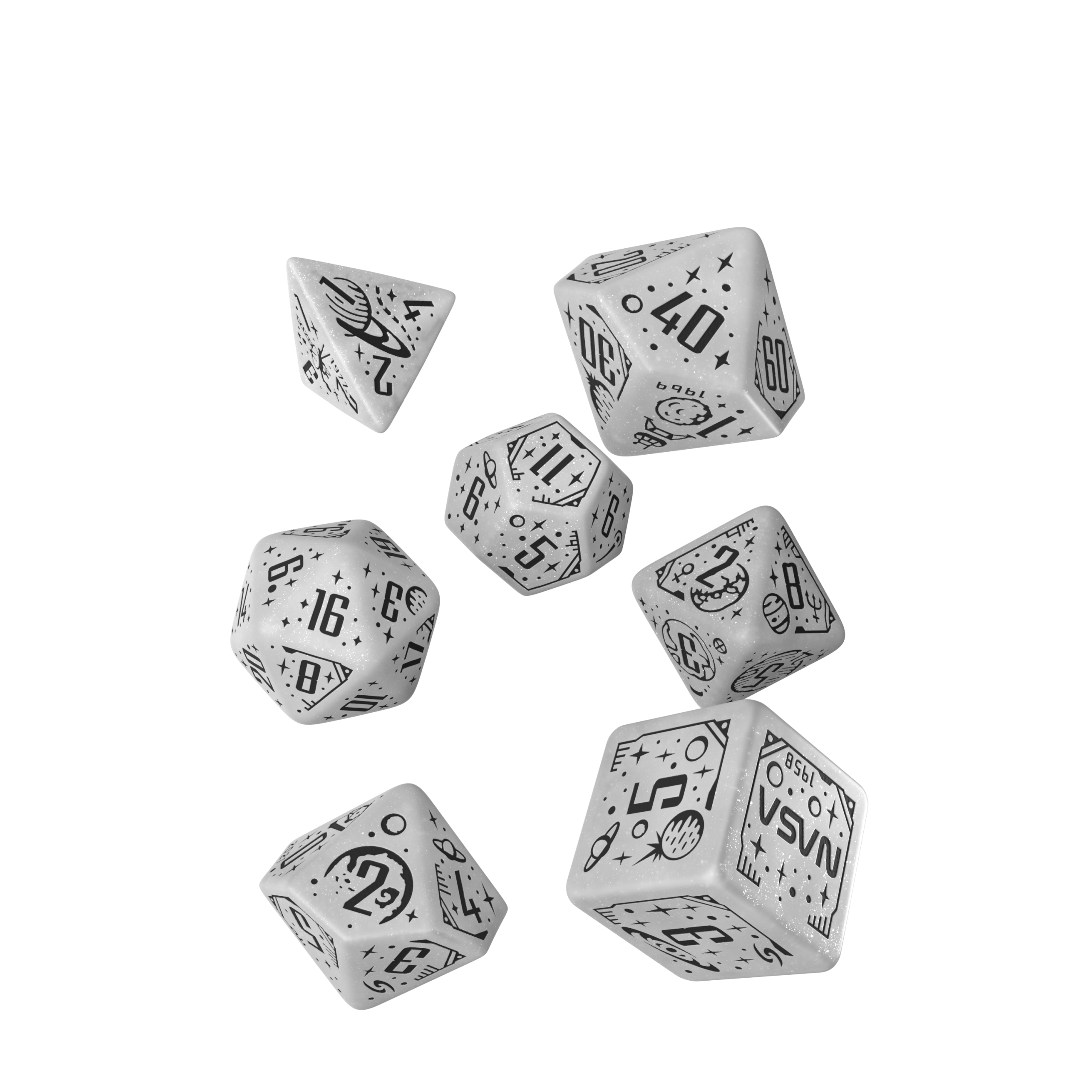 Closer to the starlight! Join us in commemorating the most significant achievements in human history. The Space Dice Set: Apollo features 7 unique polyhedrons showcasing motifs related to space exploration. The dice are white (infused with glitter dust), while the engravings are black. This is a wonderful gift for any sci-fi-loving RPG player or a fan of astronomy and science.
